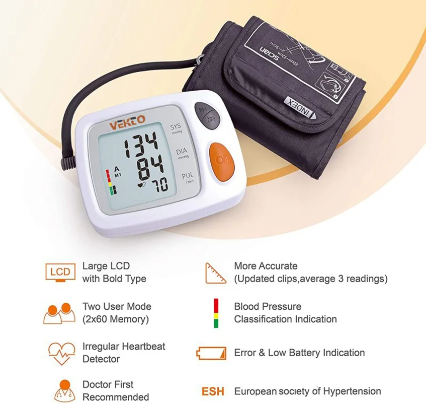 فشارسنج دیجیتال بازویی وکتو مدل Vekto LD-588 با مکانیزم دیجیتالی عملکرد بسیار آسان باعث سهولت استفاده برای افراد ناشنوا و کم سواد و… میباشد.فشارسنج دیجیتال بازویی سخنگو وکتو مدل Vekto LD-588 مطابق با تکنولوژی نوسان سنجی و الگوریتم فازی برای اندازه گیری ضربان قلب و فشار خون طراحی شده است. الگوریتم فازی الگوریتم پردازش تک تک تپش های قلب می باشد که امکان اندازه گیری با دقت بالا را فراهم می آورد.نور پس زمینه صفحه LCD این مدل دستگاه فشارسنج دیجیتال بازویی وکتو مدل Vekto LD-588 بر اساس طبقه بندی سازمان بهداشت جهانی برای سطوح مختلف فشار خون از جمله فشار خون طبیعی، کمی بالاتر از حد طبیعی و فشار خون بالا به ۳رنگ سبز، زرد، قرمز تغییر پیدا می کند. همچنین در صورت بروز خطا، نور پس زمینه به رنگ قرمز در می آید.شما می توانید علاوه بر استفاده از باطری، از آداپتور ACنیز استفاده نمایید، لازم به ذکر است که آداپتور دستگاه از لوازم جانبی دستگاه می باشد.